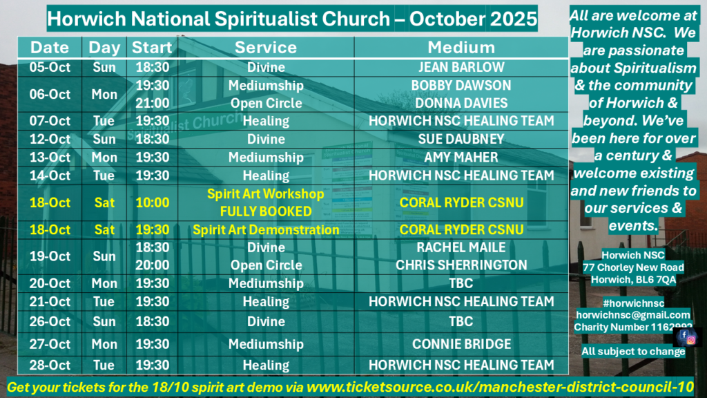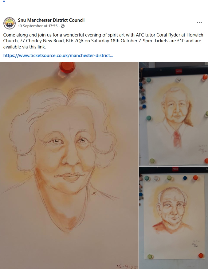 We’re delighted to host a SNU Manchester District Council event on Saturday 18th October as below. Coral is an acclaimed Spiritual Artist and follows her fully booked workshop during the day with an evening demonstration 7pm.