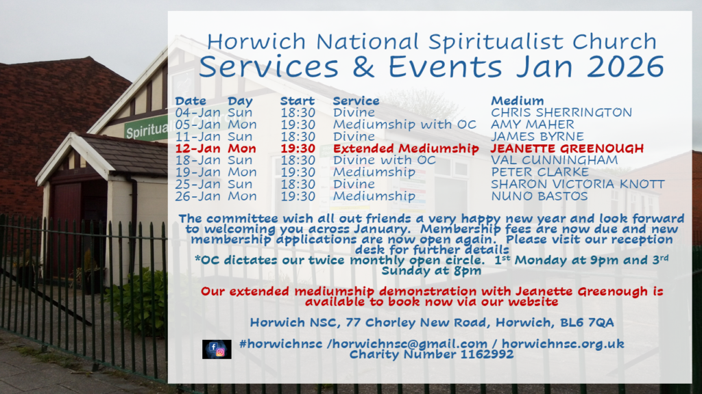 Join David at Horwich NSC on Friday 6th ad Saturday 7th February 2026. You can book your place at our church reception desk or via out online booking hub www.ticketsource.co.uk/horwich-spiritualist-church.